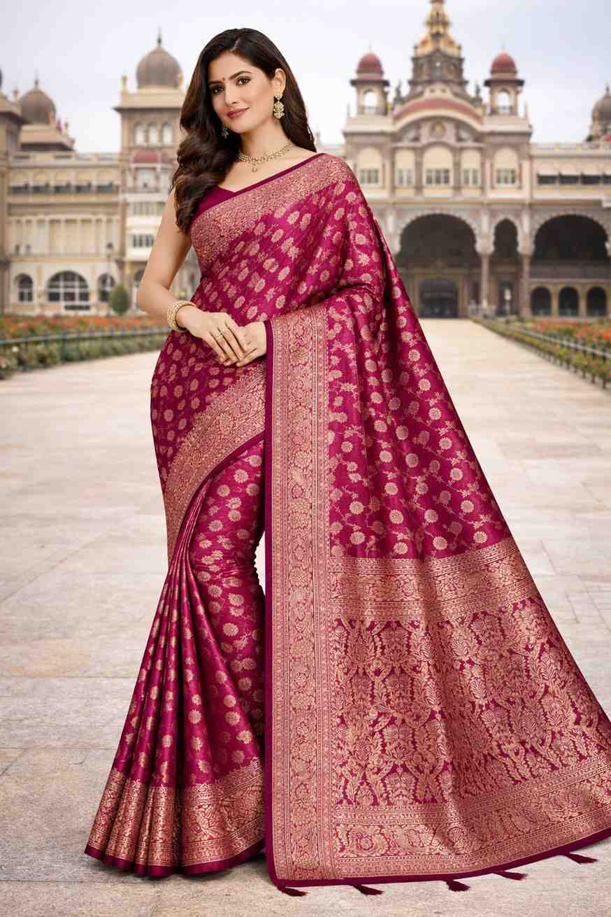 - Stunning deep maroon-pink color enhanced with elegant golden zari work