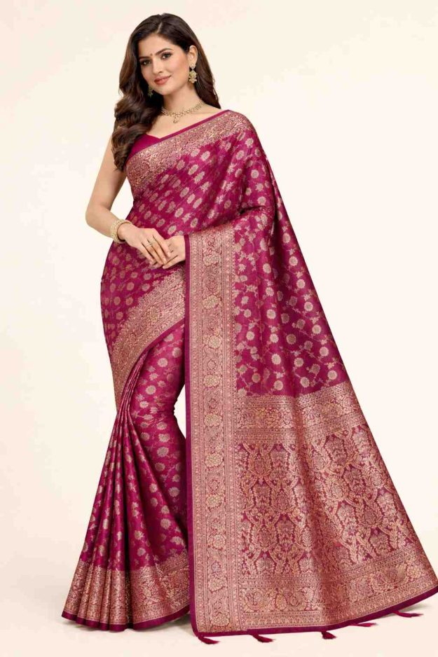 Step into elegance and tradition with this stunning Banarasi silk saree, featuring luxurious golden zari floral motifs on a rich maroon-pink base. The grand floral border and intricate pallu elevate the look, making it a perfect choice for weddings, traditional events, and festive occasions. Crafted from premium Banarasi silk, the saree offers a soft feel and effortless drape while maintaining a graceful structure. The golden woven blouse piece complements the saree beautifully, letting you complete your look with ease and sophistication. Let this timeless Banarasi silk saree add a touch of regal charm and ethnic glamour to your wardrobe.